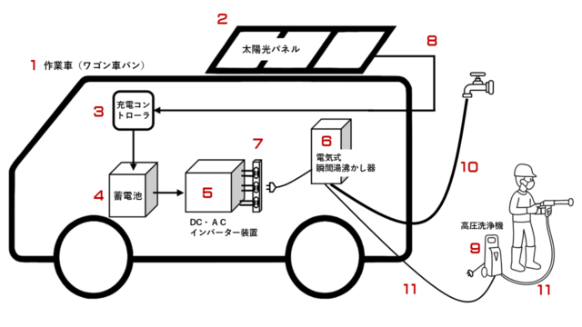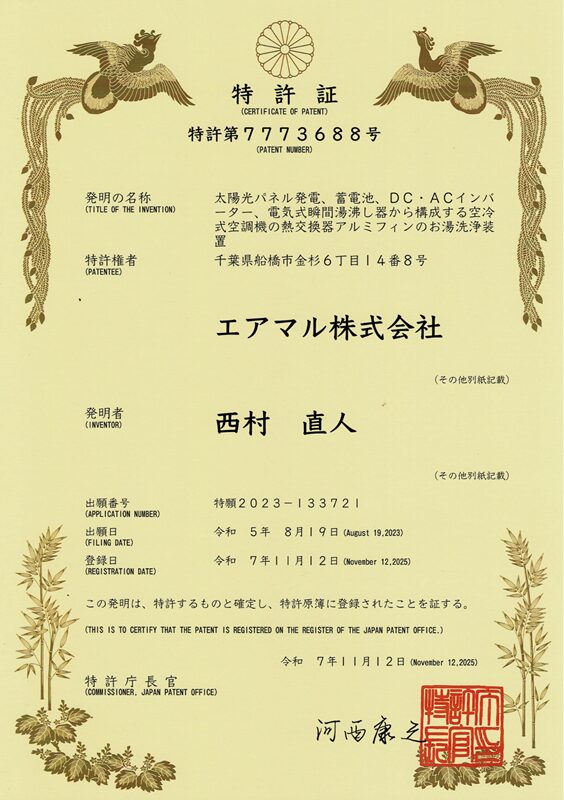 新たな特許を取得しました 2025 12/21 省エネ・節電対策 2025年12月21日 ・太陽光パネル発電・蓄電池・DC・ACインバーター・電気式瞬間湯沸し器を組み合わせたシステムで、空冷式空調機の熱交換器アルミフィンをお湯で洗浄する装置 省エネ・節電対策
